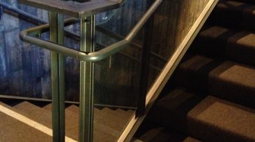 Grab rail mounted to post of glass guardrail featuring a wrap-around transition...