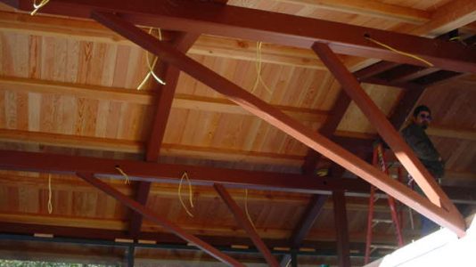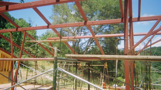 Construction photo of an exterior angled sunshade frame at glass wall.