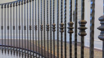 Ornamental iron pickets face mounted to wall on this circular guard rail