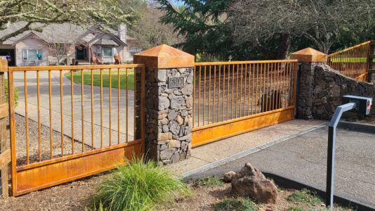 Gates Single Swing Driveway Gate – Project #1881 Photo 1 Single swing driveway gate for a refined, cohesive entry system, features: 2″ x 2″ x ...